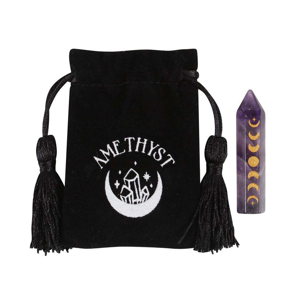 This beautiful amethyst crystal point is perfect in size for travel altars, desk decor or taking on the go for extra protection. Features a gold-tone moon phase engraving and comes with a matching drawstring bag for storage and safe-keeping. Designed by Something Different Wholesale and part of the Modern Magic range of contemporary crystal themed gifts and home
