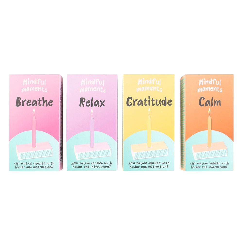 Practise positive thinking and mindfulness with this set of affirmation candles. Set includes Breathe (pink), Relax (purple), Gratitude (yellow) or Calm (orange) to dedicate a moment each day to meditate and clear your mind. Each sliding box doubles as a holder and includes 3 unscented candles with a matching mantra.