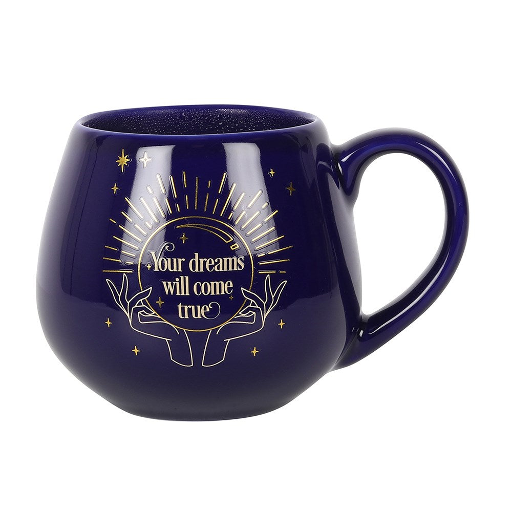 Add a hint of extra magic with every warm cup of tea. This rounded mug features a captivating colour change design that reveals a hidden fortune within the mystical crystal ball after a warm beverage is added. Hidden text reads, 'Your dreams will come true' on a blue base. Holds approximately 500ml. Do not microwave. Hand wash only.