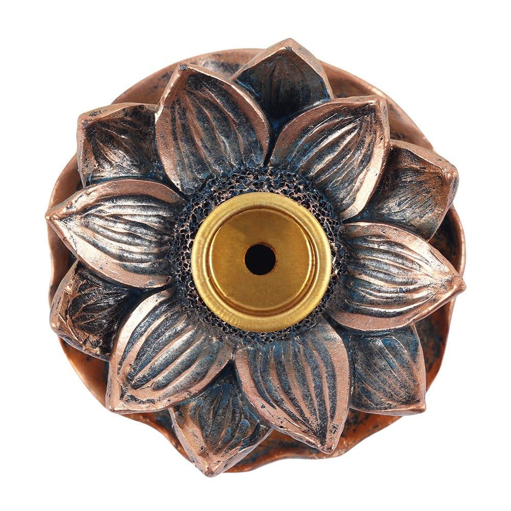 A beautiful backflow incense burner in a bronze lotus flower design. When the cone is lit the smoke from the cone cascades downwards in a mesmerising waterfall effect to pool at the bottom. Beautiful to watch.
