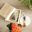 This set of chakra crystals includes 7 tumbled gemstones, a selenite wand for cleansing and a wooden Flower of Life crystal grid presented in a matching wooden gift box. Used for balancing and enhancing the energies of the 7 chakras, crystals are a powerful metaphysical tool to promote inner and outer wellbeing. Tumblestones include clear quartz (crown), amethyst (third eye), lapis lazuli (throat), green aventurine (heart), yellow jade (solar plexus), carnelian (sacral) and hematite (root)