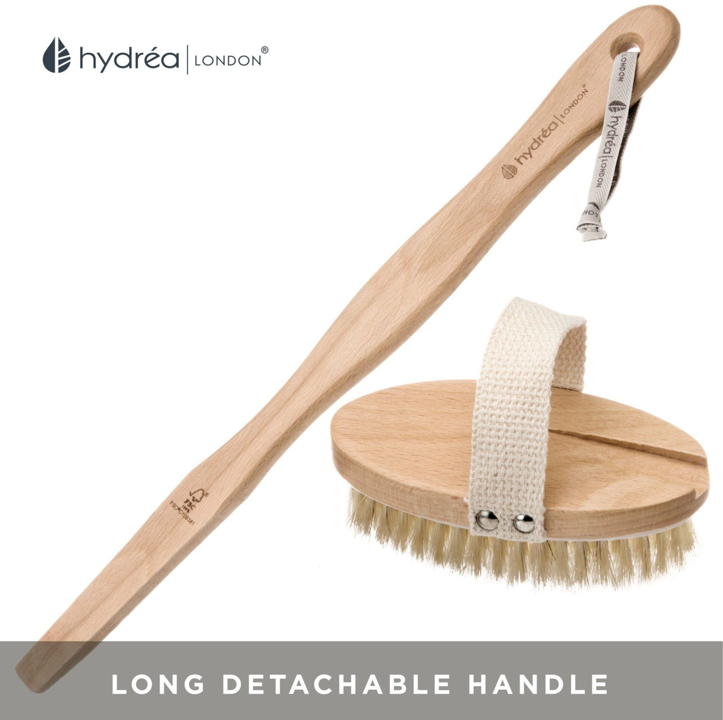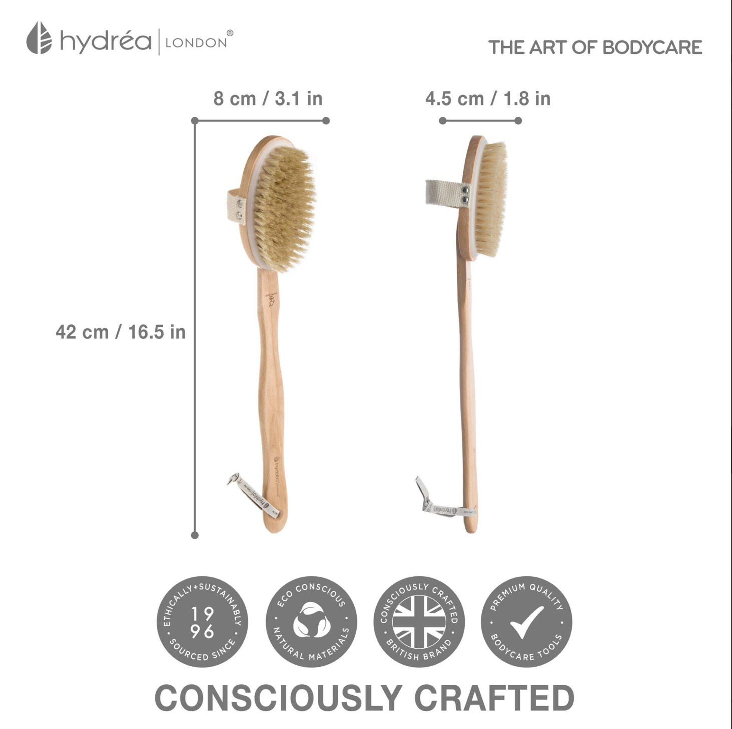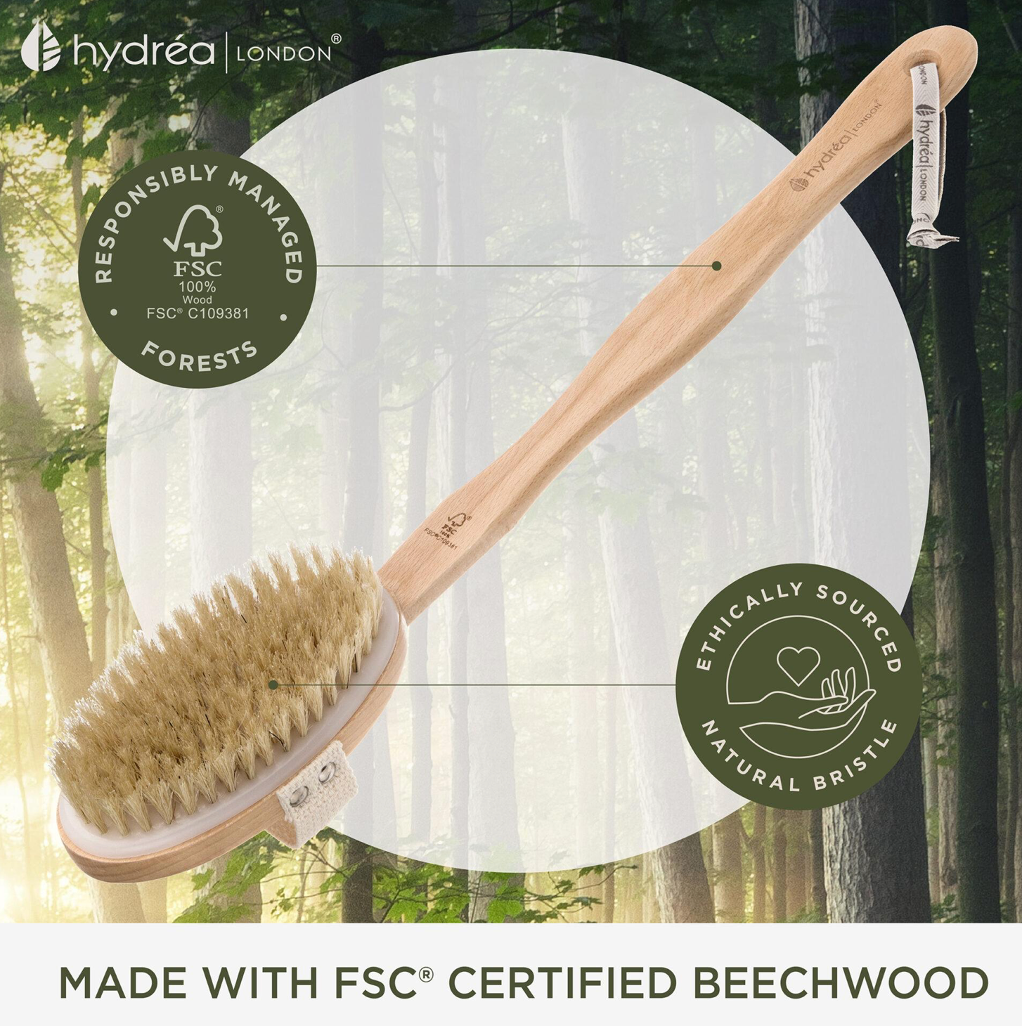 HYDREA LONDON DURABLE BODY BRUSH WITH WATER-PROTECTIVE PLASTIC PLATE – NATURAL BRISTLE & LONG DETACHABLE HANDLE, FSC® CERTIFIED BEECHWOOD