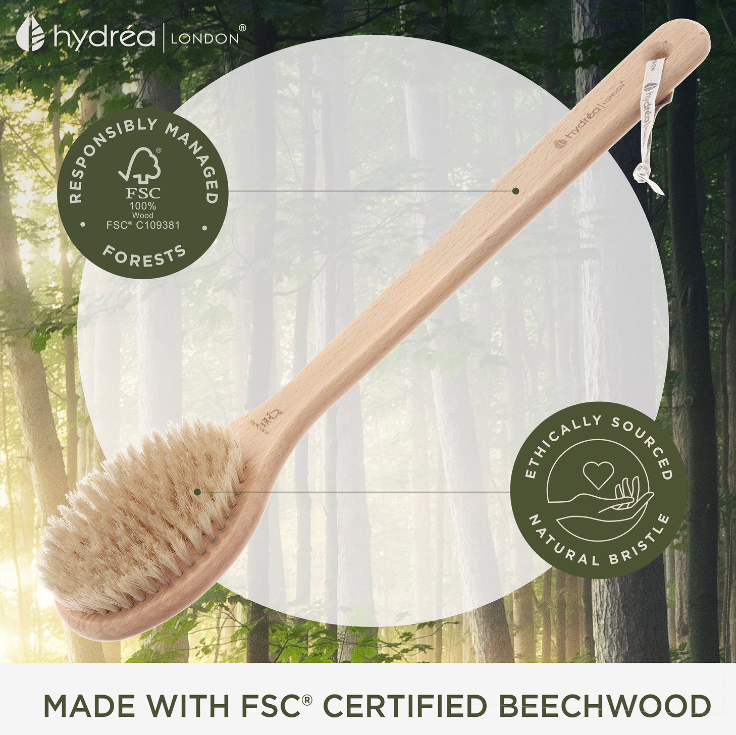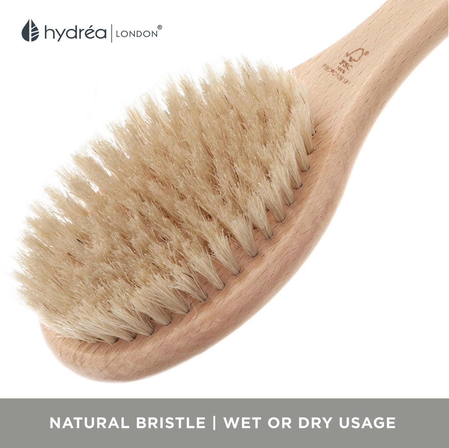 HYDREA LONDON LONG-HANDLED WET & DRY BODY BRUSH – FSC® CERTIFIED BEECHWOOD WITH NATURAL BRISTLE