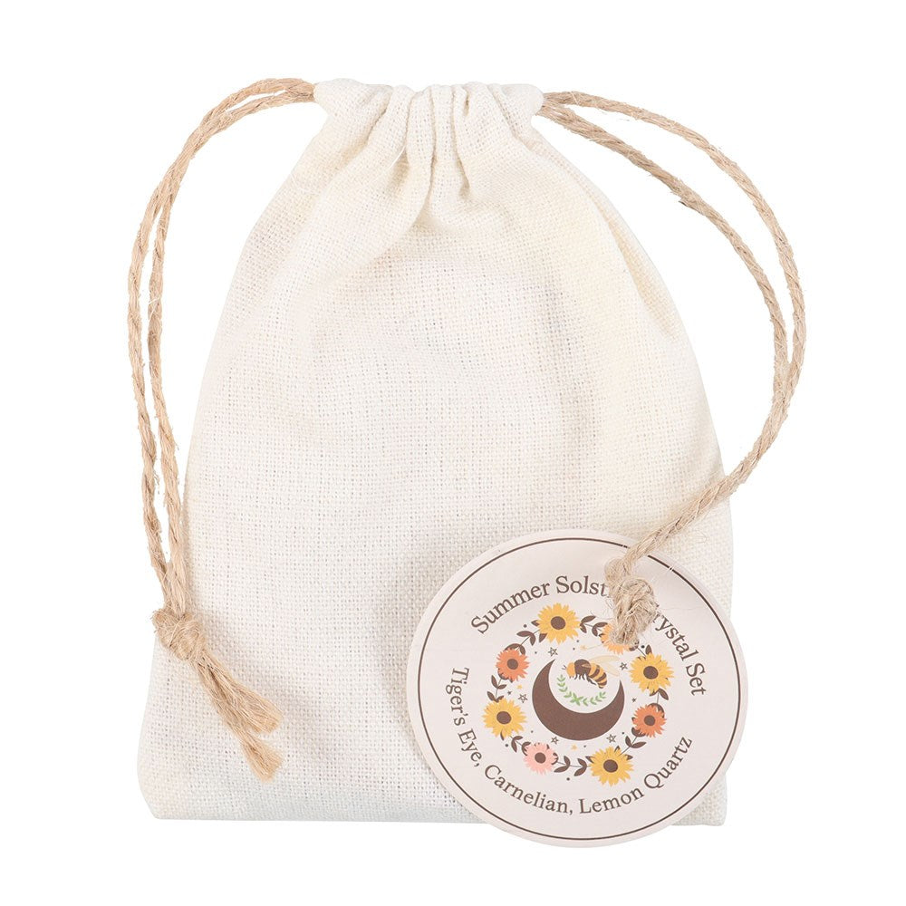 Celebrate the sun's radiant energy with this Summer Solstice crystal set featuring Tiger s Eye, Carnelian, and Lemon Quartz. With each stone known for its uplifting and empowering properties, this set is perfect for summertime rituals, meditation, or daily intention-setting. Includes an eco-friendly drawstring pouch and informative crystal cards. Designed by Something Different and part of the Bee Radiant collection of home decor and ritual accessories.