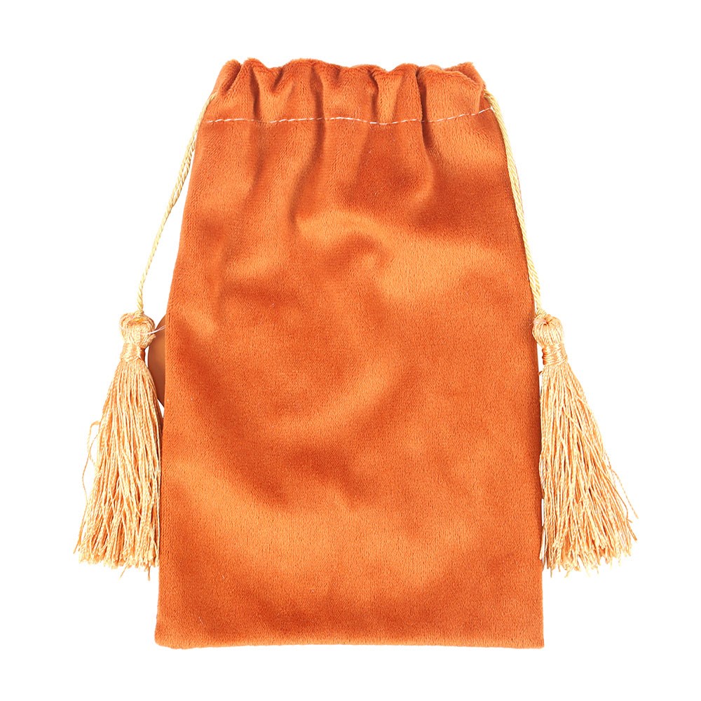 A soft tan velvet drawstring bag featuring a gold printed The Wheel tarot card design. Ideal for storing tarot decks, crystals, or small accessories. Designed by Something Different Wholesale and part of the Vintage Tarot collection of mystical gifts and accessories.